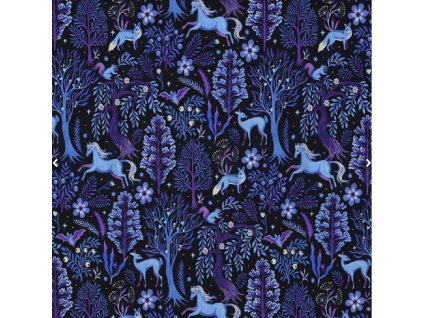 Teplákovina s motivem kouzelného lesa, měkká a hřejivá látka ideální na dětské mikiny, tepláky a volnočasové oblečení.