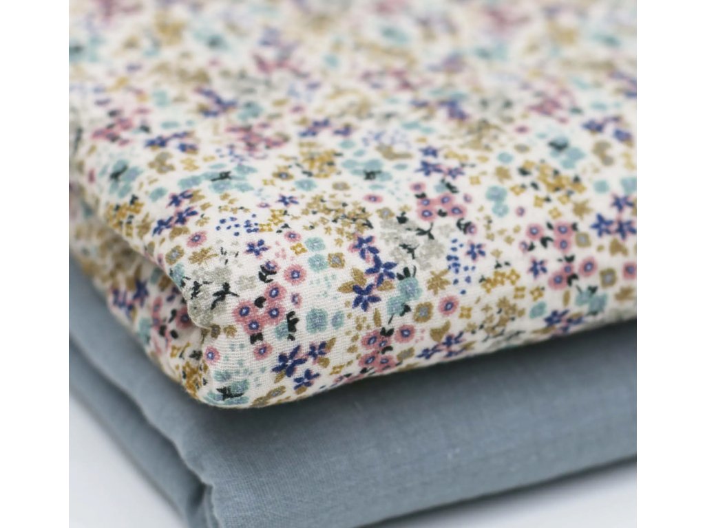 Mušelín - Drobné kvítky je lehký a vzdušný (double gauze), příjemný i pro citlivou pokožku. Hodí se na letní šaty, šátky, dětské plenky a zavinovačky. Po vyprání získá typickou jemně zmačkanou strukturu, která se nežehlí.