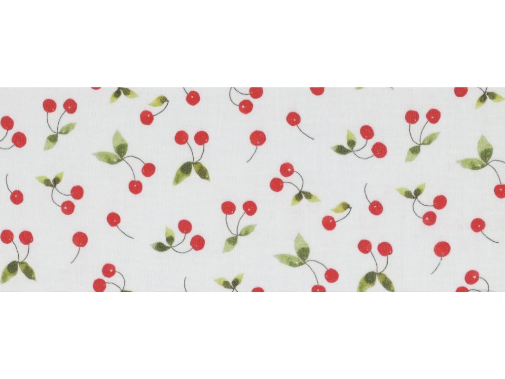 Mušelín - Třešně na bílé je lehký a vzdušný materiál, vhodný na letní oblečení, šátky a dětské doplňky. Příjemný k pokožce a snadný na údržbu.