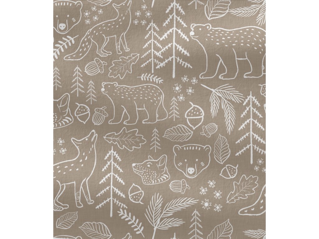 Teplákovina - Bílá zvířata na Taupe je hřejivý a přitom prodyšný materiál ideální na mikiny, tepláčky, šaty a domácí sety. Na rubu může být jemně počesaný pro extra pohodlí. Snadno se kombinuje s náplety a žebrovanými úplety do barevně sladěných outfitů.