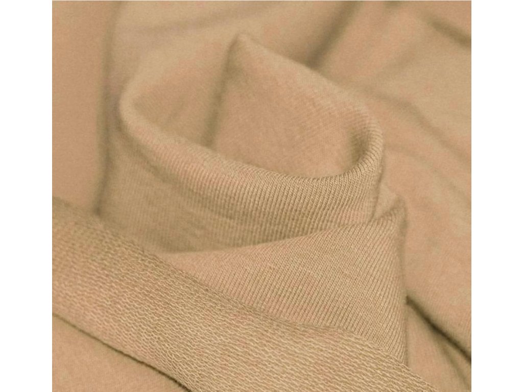 Teplákovina - Camel je hřejivý a přitom prodyšný materiál ideální na mikiny, tepláčky, šaty a domácí sety. Na rubu může být jemně počesaný pro extra pohodlí. Snadno se kombinuje s náplety a žebrovanými úplety do barevně sladěných outfitů.