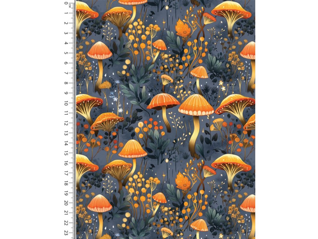 je kvalitní, pružná a příjemná látka s hravým motivem houbiček. Potisk barevných houbiček na modrém podkladu osloví malé dobrodruhy a milovníky lesa. Tento design přináší originální vzhled a dodá každému ušitému kousku hravý charakter.