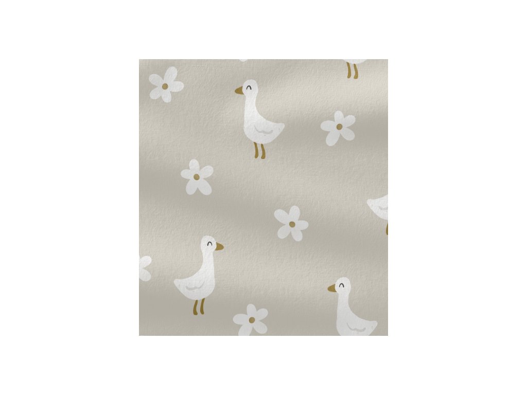Teplákovina s potiskem hus a jemných kopretin je něžný a hravý materiál, který potěší děti i dospělé milovníky přírodních motivů. Vzor působí přátelsky a venkovsky, takže dodá každému ušitému kousku kouzelný vzhled. Materiál je měkký, pružný a příjemný na dotek, což zajišťuje pohodlí při každodenním nošení.