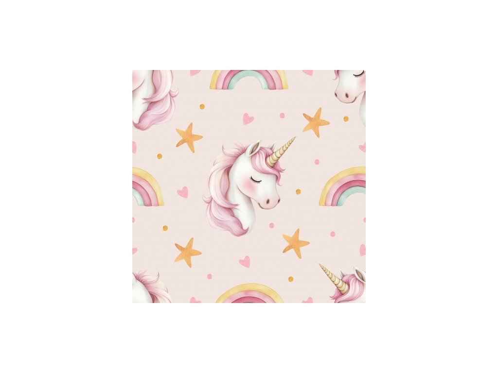 Teplákovina - Jednorožec s duhou je měkká a hřejivá, ideální na mikiny, tepláčky a pohodlné sety. Materiál je příjemný na nošení a dobře se šije.
