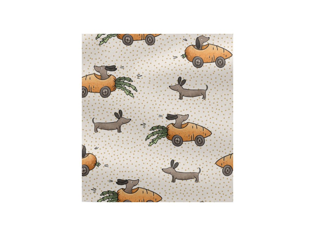 je originální, pružná a hřejivá látka s hravým motivem, který rozzáří každý ušitý kousek. Potisk roztomilého jezevčíka s mrkví působí vtipně a přátelsky, takže si ji oblíbí děti i dospělí, kteří mají rádi veselý a neotřelý design.