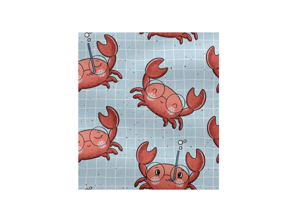 je kvalitní, pružná a příjemná látka s veselým letním motivem, který dodá oblečení hravý a originální vzhled. Potisk kraba s brýlemi působí moderně a zábavně, takže se hodí pro děti i dospělé, kteří chtějí vyniknout jedinečným designem.