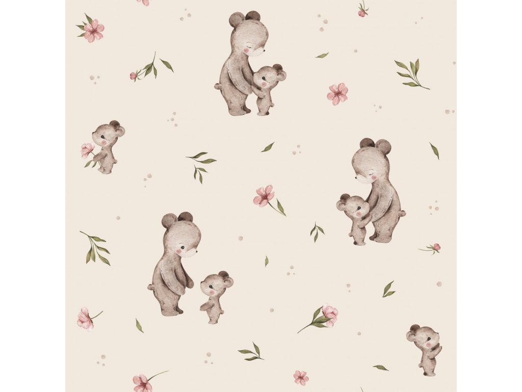 Teplákovina - Medvědí máma na béžové je měkká a hřejivá, ideální na mikiny, tepláčky a pohodlné sety. Materiál je příjemný na nošení a dobře se šije.