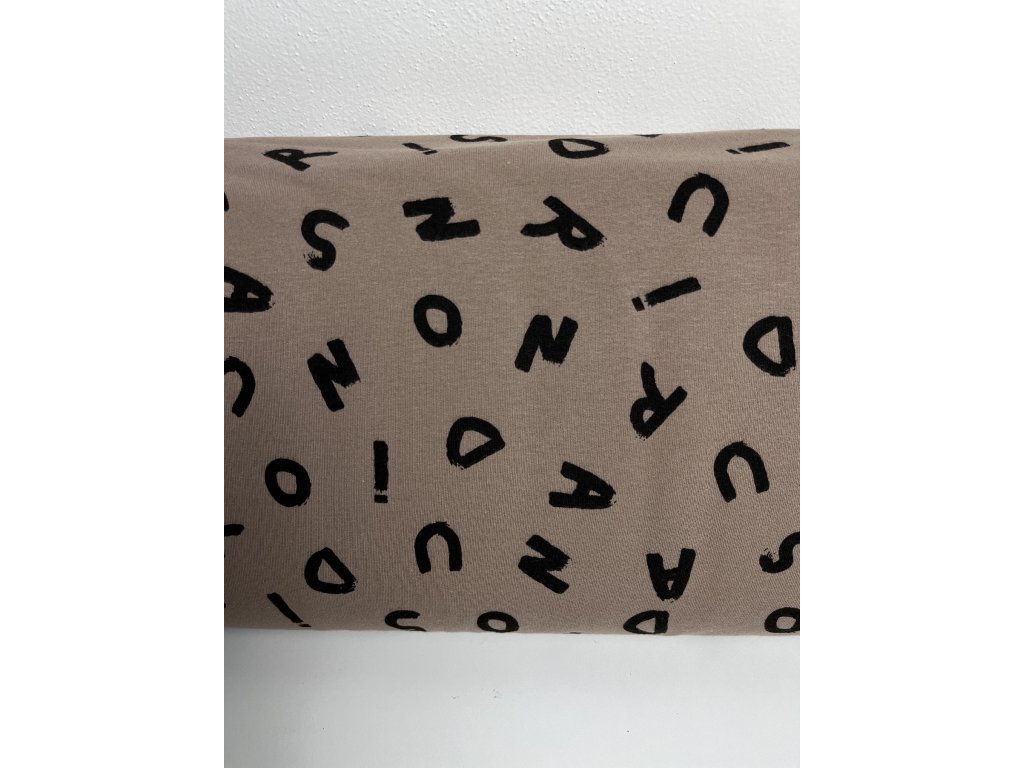 Bio Teplákovina - Písmenka na taupe 0,35 m je měkká a hřejivá, ideální na mikiny, tepláčky a pohodlné sety. Materiál je příjemný na nošení a dobře se šije.