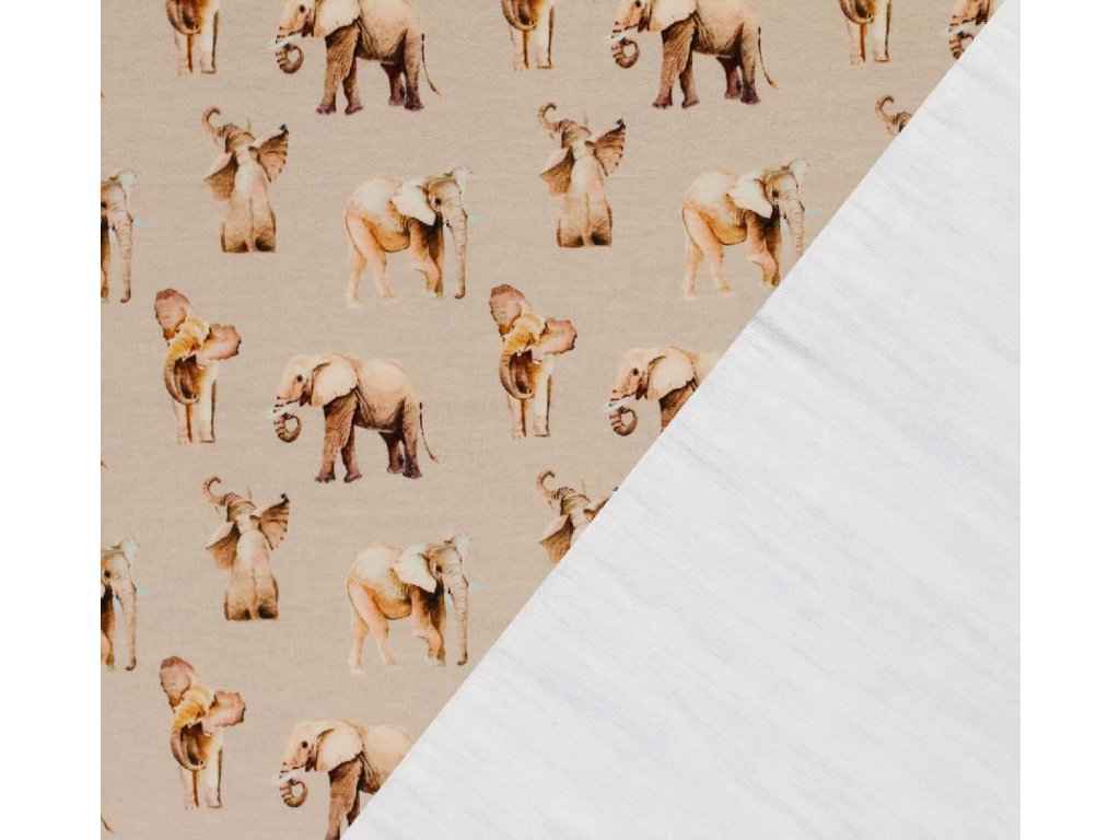 Teplákovina s potiskem slonů je hravý a přátelský materiál, který dodá každému ušitému kousku veselý a něžný vzhled. Motiv je vhodný pro děti i dospělé, kteří mají rádi přírodní a zvířecí vzory. Materiál je měkký, pružný a velmi příjemný na dotek, což zajišťuje maximální pohodlí při nošení.