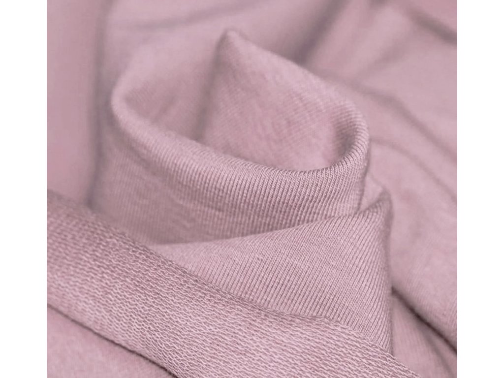 Teplákovina -Starorůžová je hřejivý a přitom prodyšný materiál ideální na mikiny, tepláčky, šaty a domácí sety. Na rubu může být jemně počesaný pro extra pohodlí. Snadno se kombinuje s náplety a žebrovanými úplety do barevně sladěných outfitů.