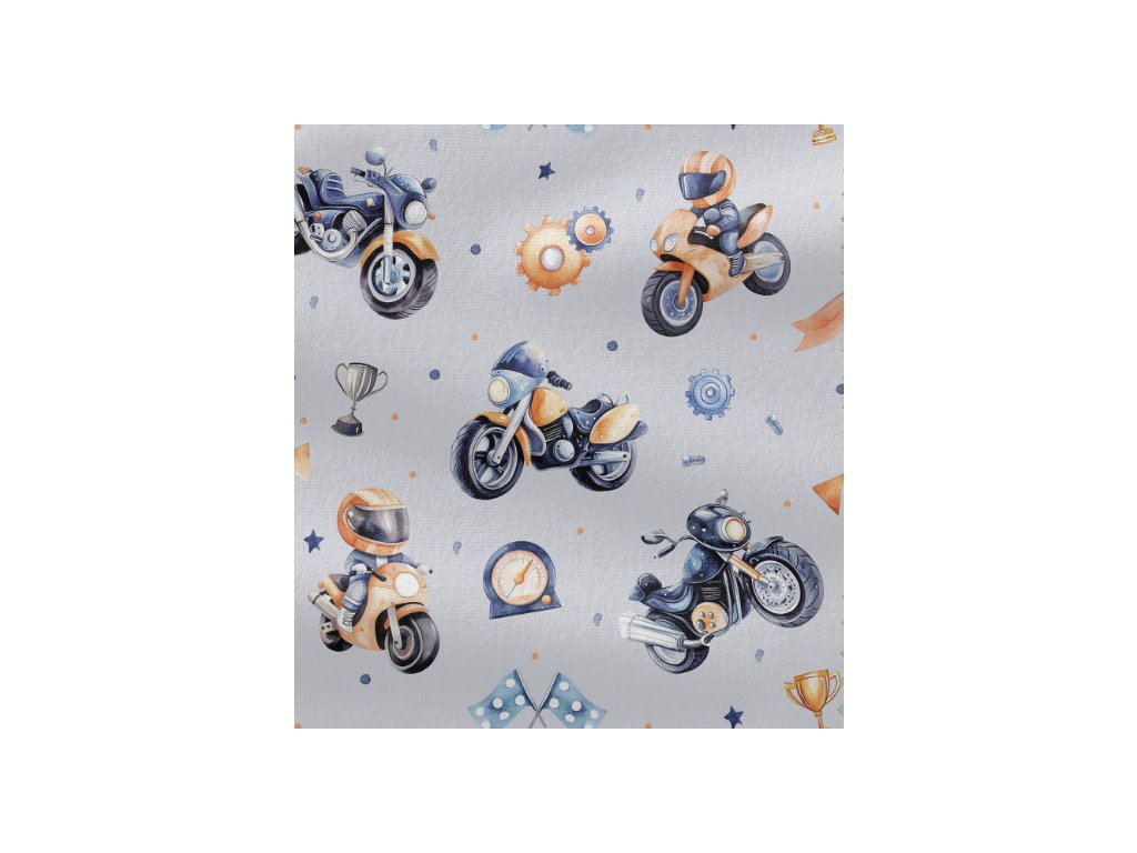 Teplákovina se vzorem motorek a motorkářských detailů je perfektní pro všechny fanoušky motoristického stylu. Tento originální potisk dodá každému ušitému kousku výrazný a moderní vzhled. Materiál je měkký, příjemný na dotek a dostatečně pružný, aby poskytl pohodlí při každodenním nošení.