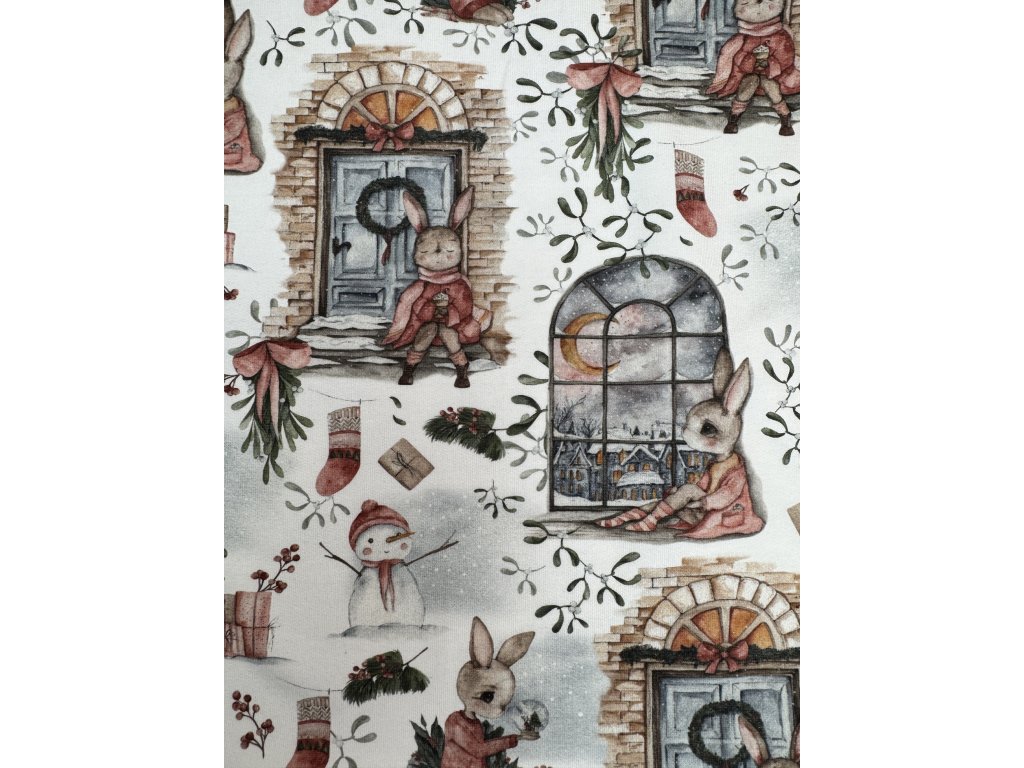 Teplákovina -Teplákovina - Zajíček a Vánoce 0,4 m je měkká a hřejivá, ideální na mikiny, tepláčky a pohodlné sety. Materiál je příjemný na nošení a dobře se šije.