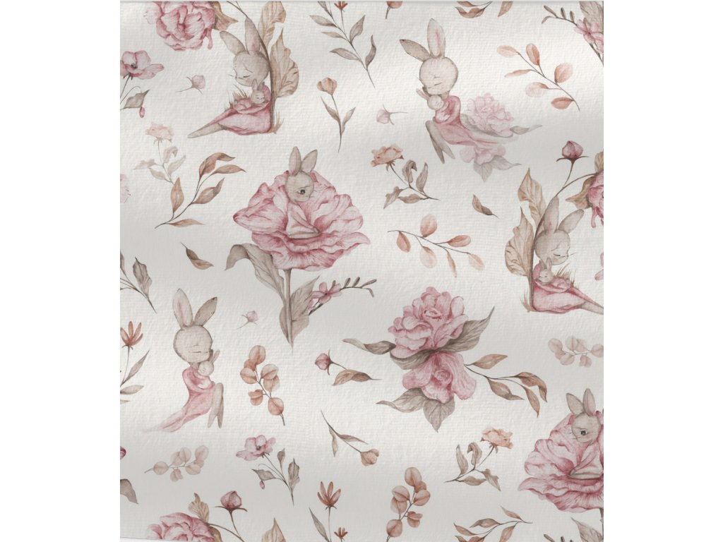 Teplákovina - Zajíček na louce je měkká a hřejivá, ideální na mikiny, tepláčky a pohodlné sety. Materiál je příjemný na nošení a dobře se šije.