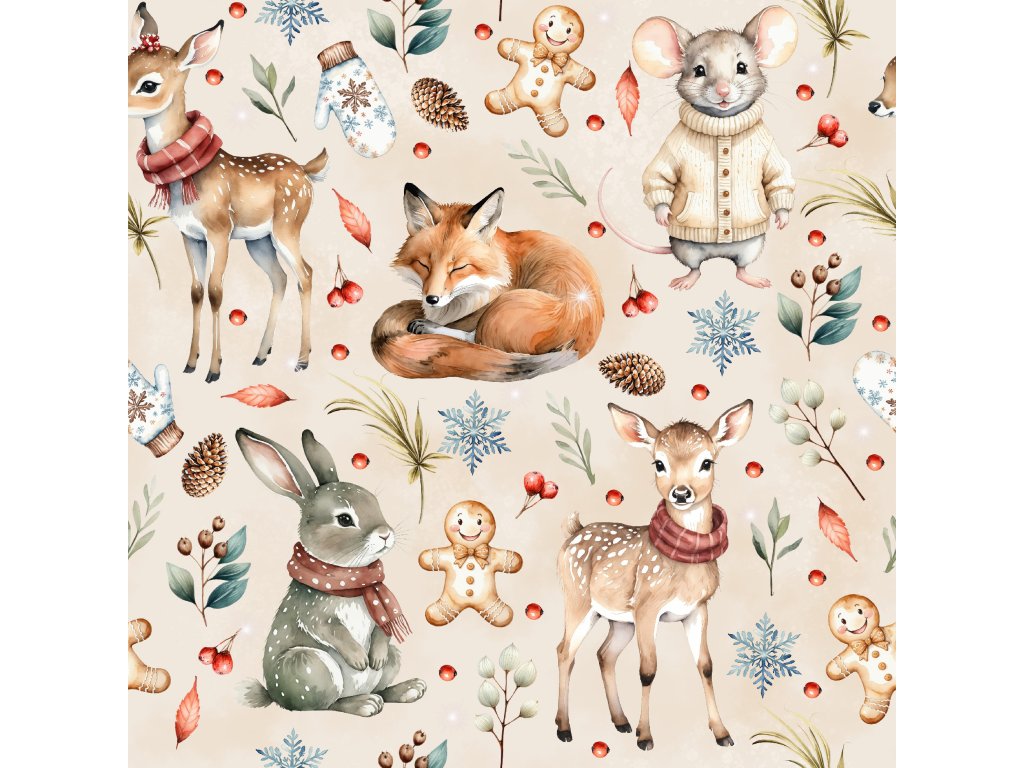 Teplákovina - Zvířátka o vánocích je měkká a hřejivá, ideální na mikiny, tepláčky a pohodlné sety. Materiál je příjemný na nošení a dobře se šije.