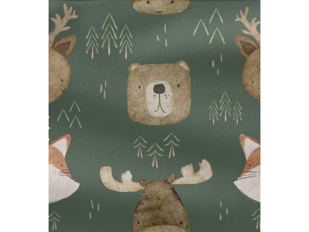Teplákovina s motivem zvířecích hlav na zeleném podkladu vnese do dětského šatníku originalitu i hravost. 🐻🦊 Je hebká, hřejivá a pohodlná – skvělá na mikiny, šaty i tepláčky, které budou děti nosit každý den.