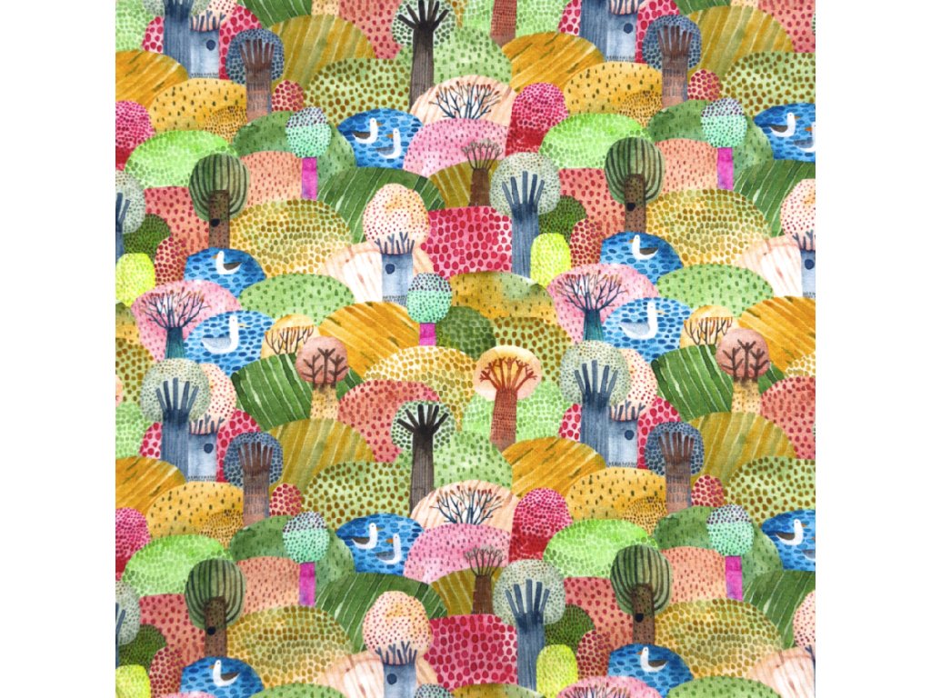 Úplet - Barevná krajina je měkký a prodyšný úplet, vhodný na trička, šaty, pyžama i dětské oblečení. Materiál je poddajný, příjemný k pokožce a dobře se šije, takže je vhodný i pro začínající švadleny. Snadno jej zkombinujete s jednobarevnými i vzorovanými látkami.