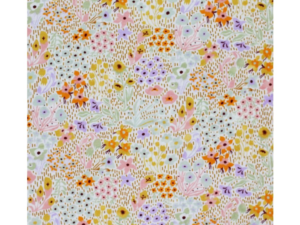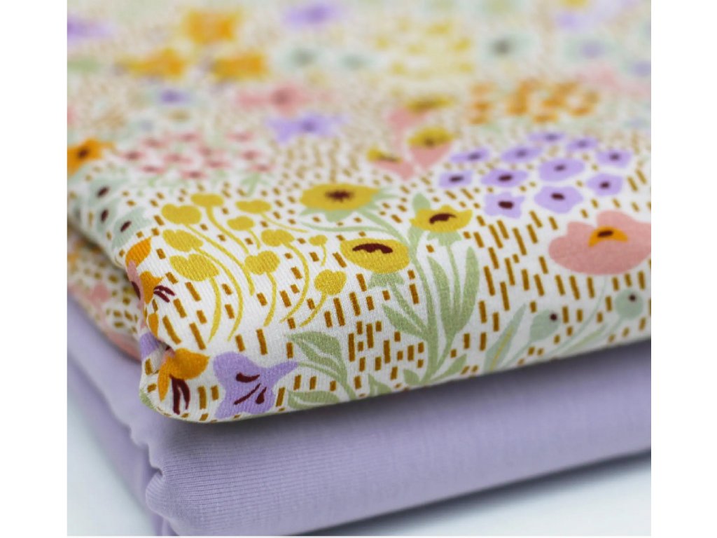 Úplet - Barevné divoké květy je měkký a prodyšný úplet, vhodný na trička, šaty, pyžama i dětské oblečení. Materiál je poddajný, příjemný k pokožce a dobře se šije, takže je vhodný i pro začínající švadleny. Snadno jej zkombinujete s jednobarevnými i vzorovanými látkami.