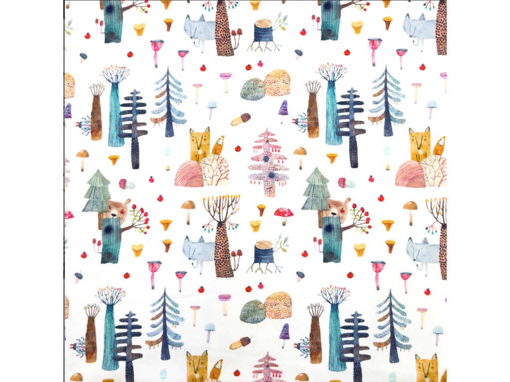 Úplet - Barevný les je měkký a prodyšný úplet, vhodný na trička, šaty, pyžama i dětské oblečení. Materiál je poddajný, příjemný k pokožce a dobře se šije, takže je vhodný i pro začínající švadleny. Snadno jej zkombinujete s jednobarevnými i vzorovanými látkami.