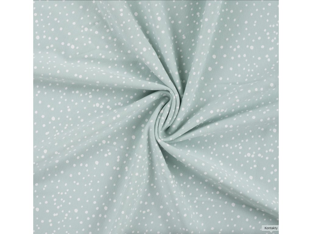 Úplet - Bílé puntíky na mentolové je příjemná a pružná látka vhodná na trička, šaty i dětské oblečení. Snadno se kombinuje s dalšími materiály a dobře drží tvar.