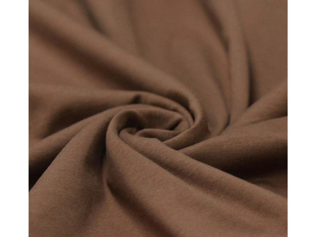Úplet - hnědá je měkký a prodyšný úplet, vhodný na trička, šaty, pyžama i dětské oblečení. Materiál je poddajný, příjemný k pokožce a dobře se šije, takže je vhodný i pro začínající švadleny. Snadno jej zkombinujete s jednobarevnými i vzorovanými látkami.