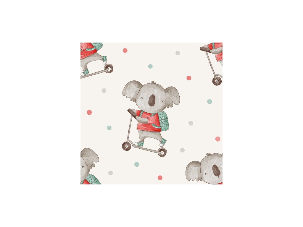 Úplet - Koala na koloběžce je příjemná a pružná látka vhodná na trička, šaty i dětské oblečení. Snadno se kombinuje s dalšími materiály a dobře drží tvar.