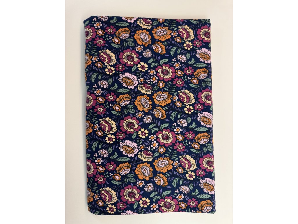 Úplet - Úplet - Květy na modré 1,4 m je měkký a prodyšný úplet, vhodný na trička, šaty, pyžama i dětské oblečení. Materiál je poddajný, příjemný k pokožce a dobře se šije, takže je vhodný i pro začínající švadleny. Snadno jej zkombinujete s jednobarevnými i vzorovanými látkami.