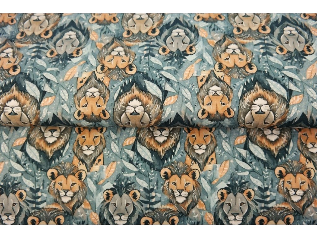 Úplet - Lvi v listí je měkký a prodyšný úplet, vhodný na trička, šaty, pyžama i dětské oblečení. Materiál je poddajný, příjemný k pokožce a dobře se šije, takže je vhodný i pro začínající švadleny. Snadno jej zkombinujete s jednobarevnými i vzorovanými látkami.