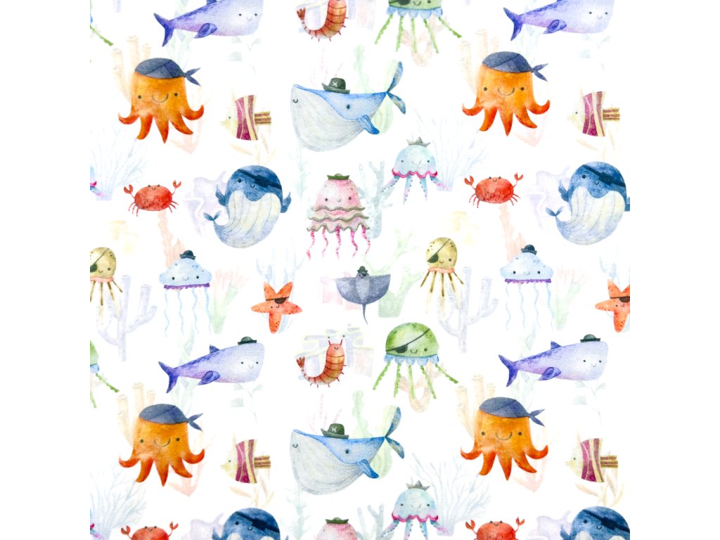 Úplet - Moře piráti je měkký a prodyšný úplet, vhodný na trička, šaty, pyžama i dětské oblečení. Materiál je poddajný, příjemný k pokožce a dobře se šije, takže je vhodný i pro začínající švadleny. Snadno jej zkombinujete s jednobarevnými i vzorovanými látkami.