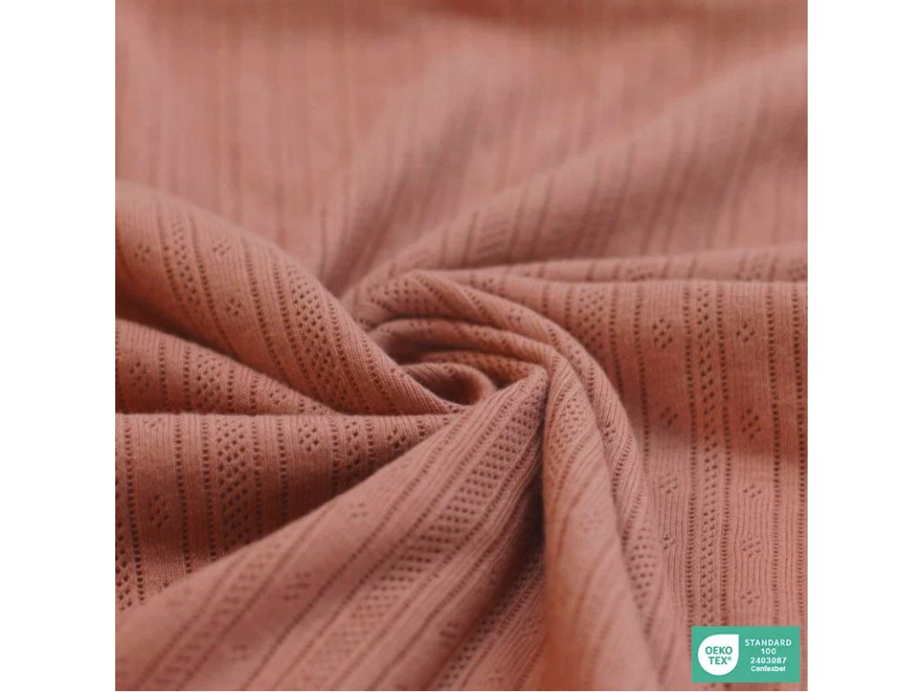 Úplet Pointelle -Clay Pink je měkký a prodyšný úplet, vhodný na trička, šaty, pyžama i dětské oblečení. Materiál je poddajný, příjemný k pokožce a dobře se šije, takže je vhodný i pro začínající švadleny. Snadno jej zkombinujete s jednobarevnými i vzorovanými látkami.