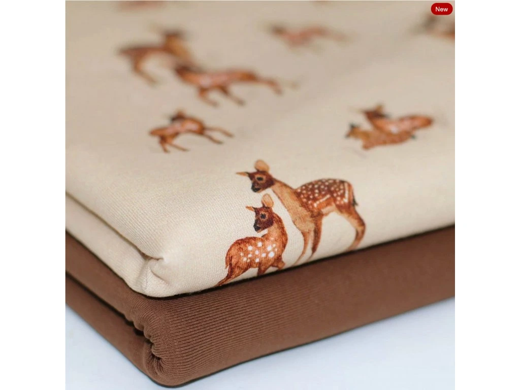Úplet - Srnky je příjemná a pružná látka vhodná na trička, šaty i dětské oblečení. Snadno se kombinuje s dalšími materiály a dobře drží tvar.