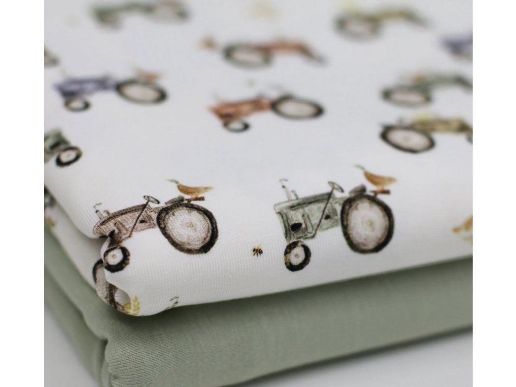 Úplet - Traktory je měkký a prodyšný úplet, vhodný na trička, šaty, pyžama i dětské oblečení. Materiál je poddajný, příjemný k pokožce a dobře se šije, takže je vhodný i pro začínající švadleny. Snadno jej zkombinujete s jednobarevnými i vzorovanými látkami.