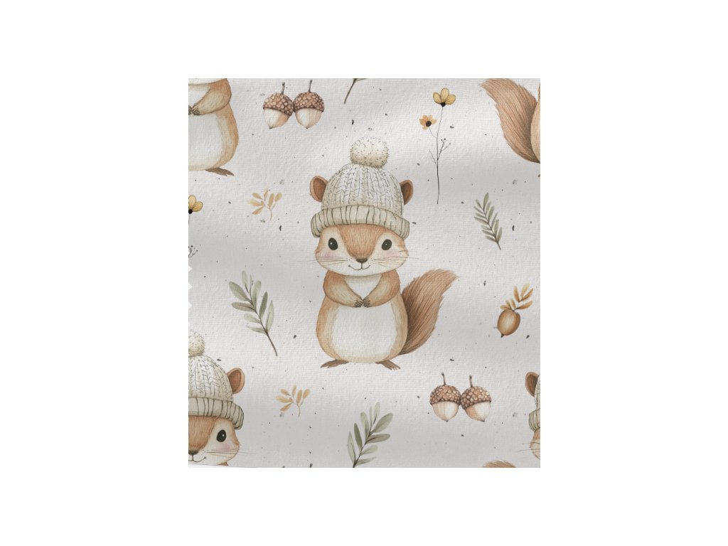 Roztomilý úplet s motivem veverky v kulichu vnese do šití radost a hravost. 🐿️❄️ Je hebký, pružný a velmi pohodlný – ideální na oblečení pro děti i dospělé. Snadno se šije a díky své kvalitě dlouho vydrží krásný. ✂️