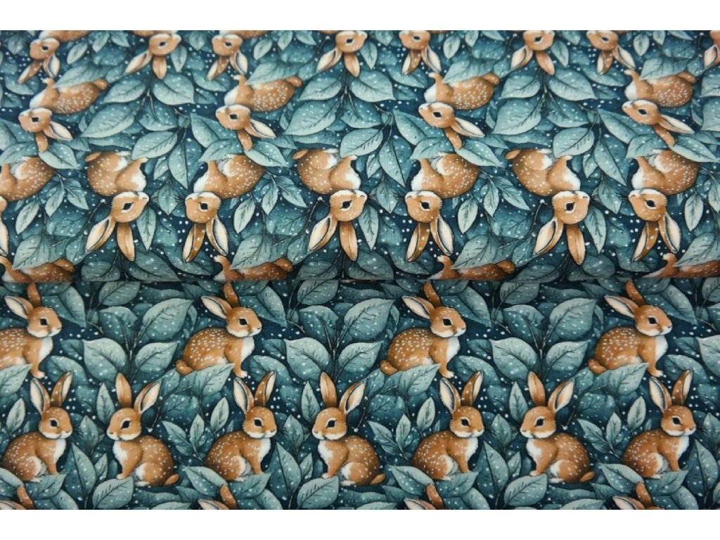 Úplet - Zajíčci v listí je měkký a prodyšný úplet, vhodný na trička, šaty, pyžama i dětské oblečení. Materiál je poddajný, příjemný k pokožce a dobře se šije, takže je vhodný i pro začínající švadleny. Snadno jej zkombinujete s jednobarevnými i vzorovanými látkami.