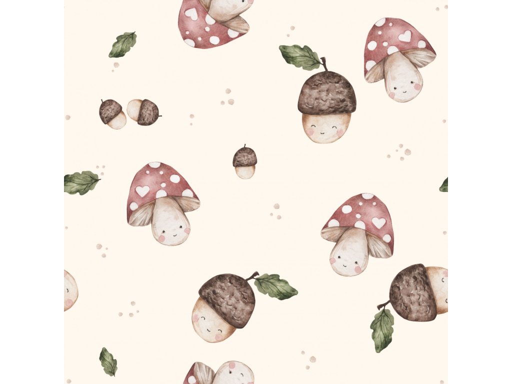 Úplet - Žaludy a mochomůrky je měkký a prodyšný úplet, vhodný na trička, šaty, pyžama i dětské oblečení. Materiál je poddajný, příjemný k pokožce a dobře se šije, takže je vhodný i pro začínající švadleny. Snadno jej zkombinujete s jednobarevnými i vzorovanými látkami.