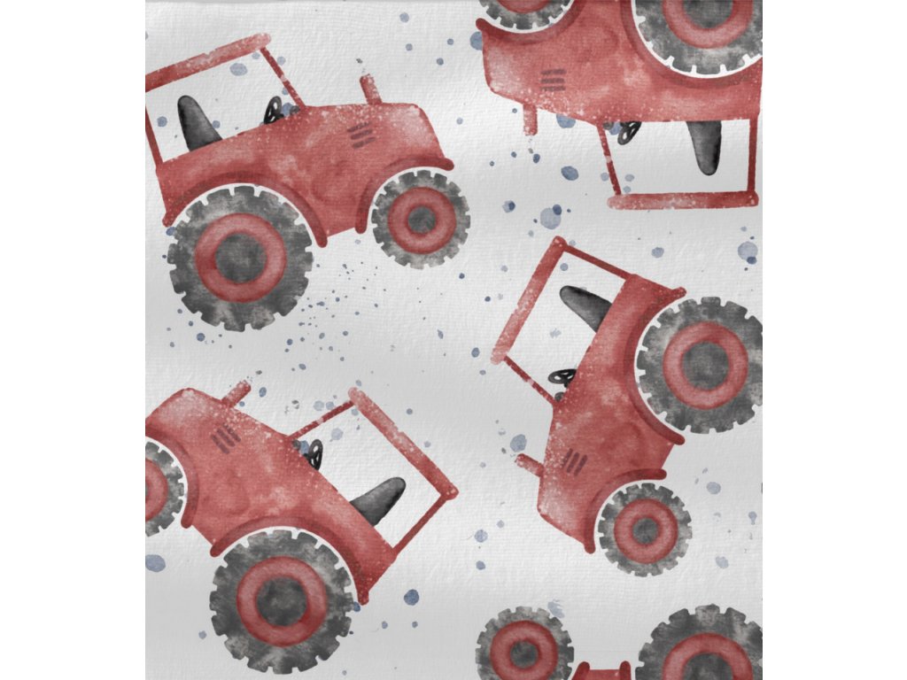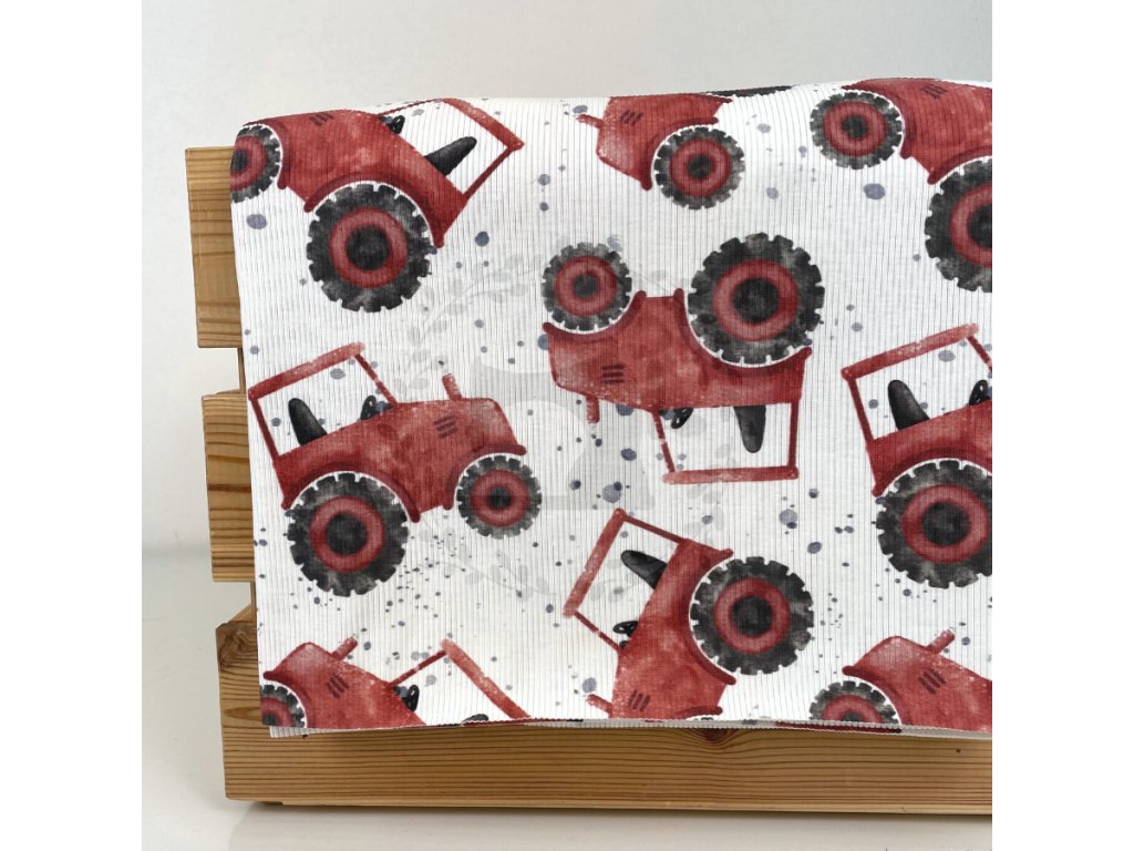 Žebrovaný úplet - Červený Traktor je příjemná a pružná látka vhodná na trička, šaty i dětské oblečení. Snadno se kombinuje s dalšími materiály a dobře drží tvar.