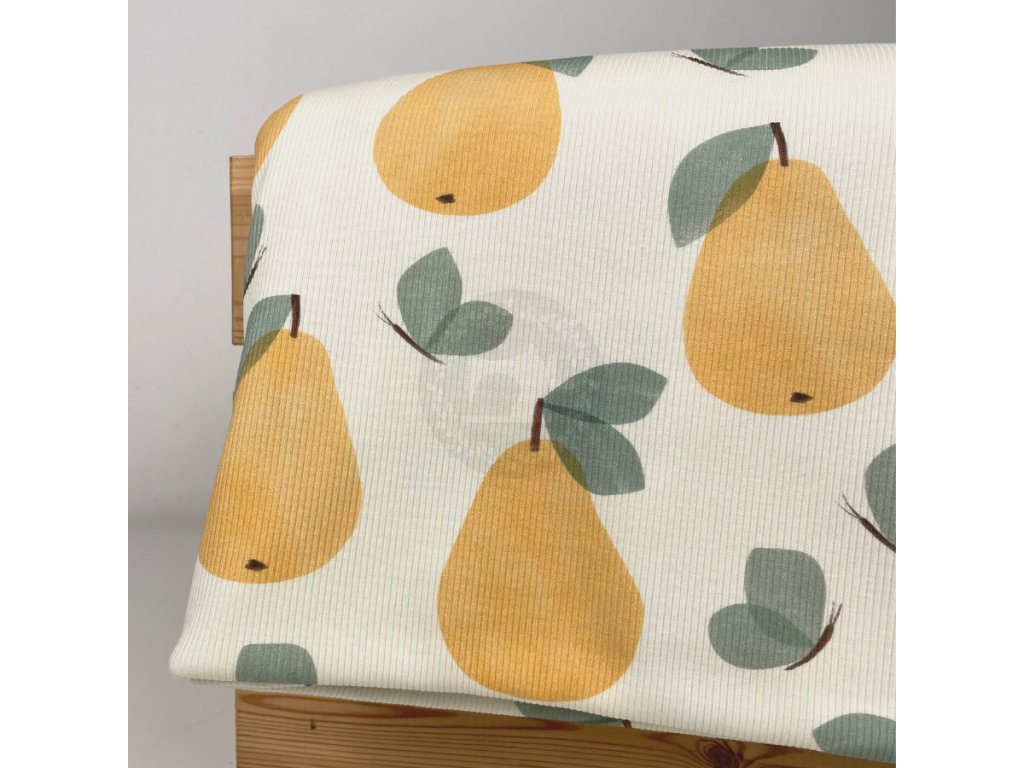 Žebrovaný úplet - Hrušky je příjemná a pružná látka vhodná na trička, šaty i dětské oblečení. Snadno se kombinuje s dalšími materiály a dobře drží tvar.