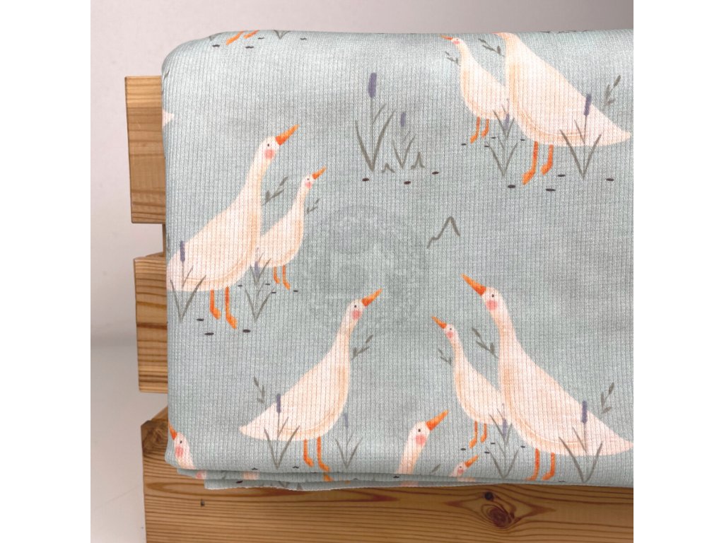 Žebrovaný úplet - Husy na modré je pružný a pohodlný materiál se žebrovanou strukturou, který pěkně přiléhá k tělu a zároveň drží tvar. Hodí se na trička, šaty, legíny, čepice a nákrčníky pro děti i dospělé. Díky směsi bavlny s elastanem je příjemný na dotek, prodyšný a snadný na údržbu – ideální pro každodenní nošení.