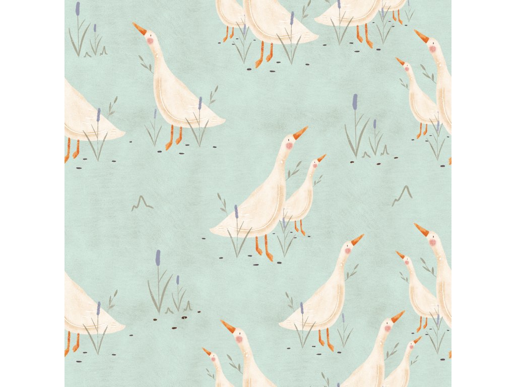Vzor bílých hus v různých pozicích na jasně modrém podkladu působí vtipně a zároveň roztomile. Látku můžete kombinovat s jednobarevnými úplety v odstínech modré, bílé nebo žluté pro harmonický a sladěný výsledek.
