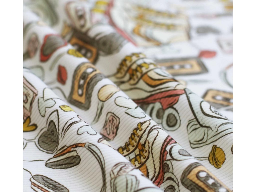 Žebrovaný úplet - Kolečkové brusle je příjemná a pružná látka vhodná na trička, šaty i dětské oblečení. Snadno se kombinuje s dalšími materiály a dobře drží tvar.