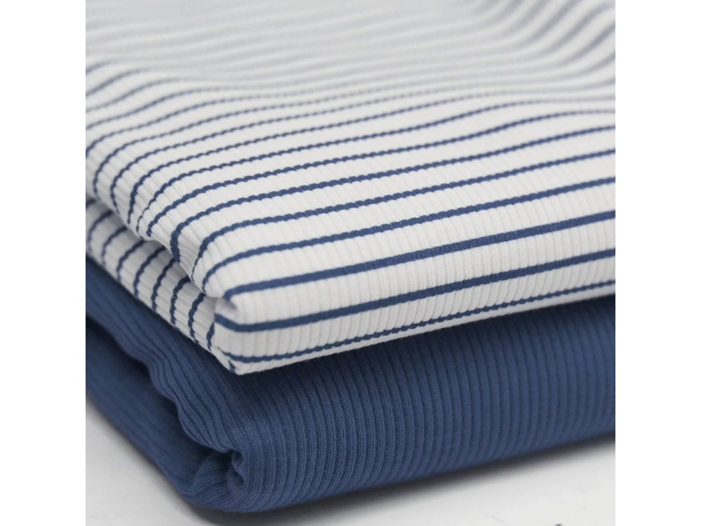 Žebrovaný úplet - modré proužky je pružný a pohodlný materiál se žebrovanou strukturou, který pěkně přiléhá k tělu a zároveň drží tvar. Hodí se na trička, šaty, legíny, čepice a nákrčníky pro děti i dospělé. Díky směsi bavlny s elastanem je příjemný na dotek, prodyšný a snadný na údržbu – ideální pro každodenní nošení.