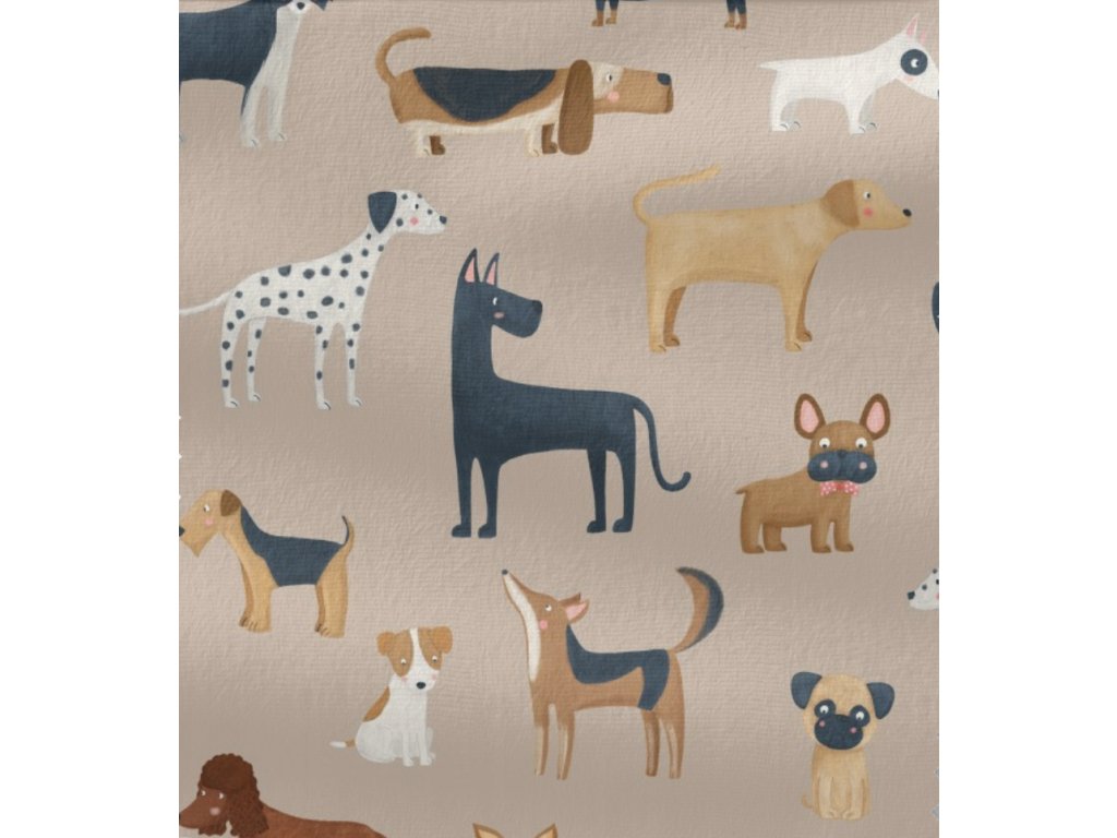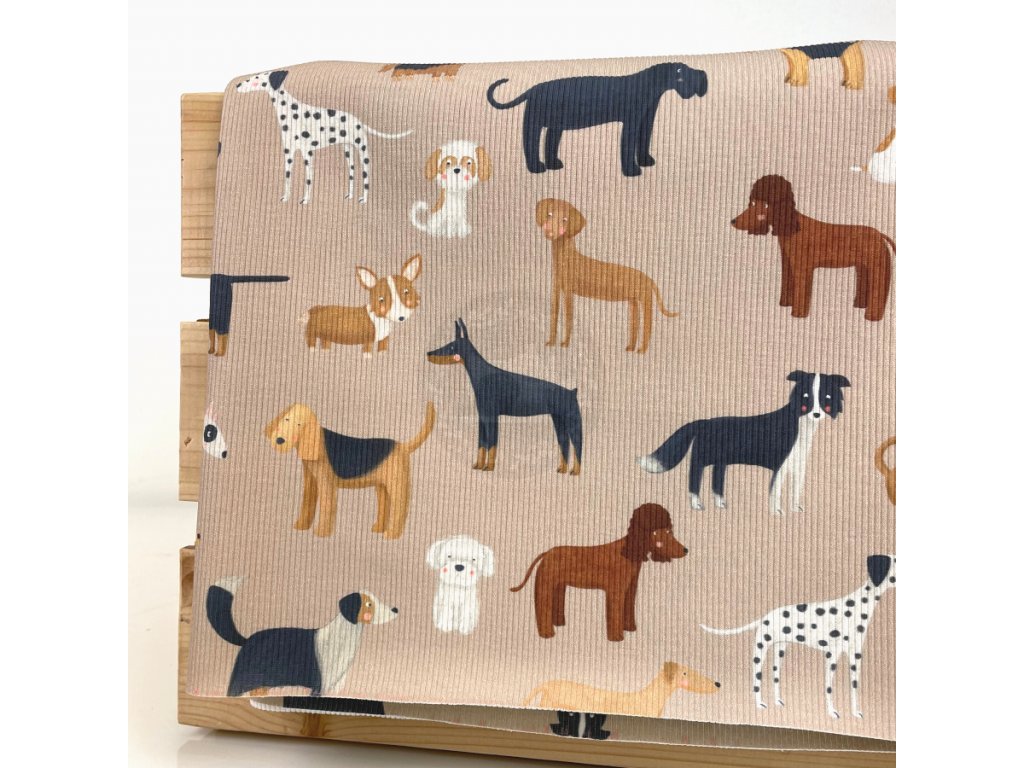 Žebrovaný úplet - Pejsci na béžové je příjemná a pružná látka vhodná na trička, šaty i dětské oblečení. Snadno se kombinuje s dalšími materiály a dobře drží tvar.