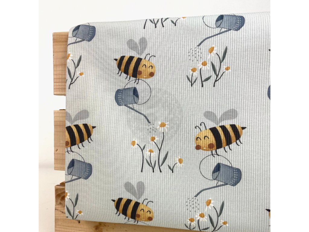 Žebrovaný úplet – Včelky s konvičkou je ideální volbou pro všechny, kdo chtějí spojit komfort, kvalitu a hravý přírodní motiv do originálních kousků.
