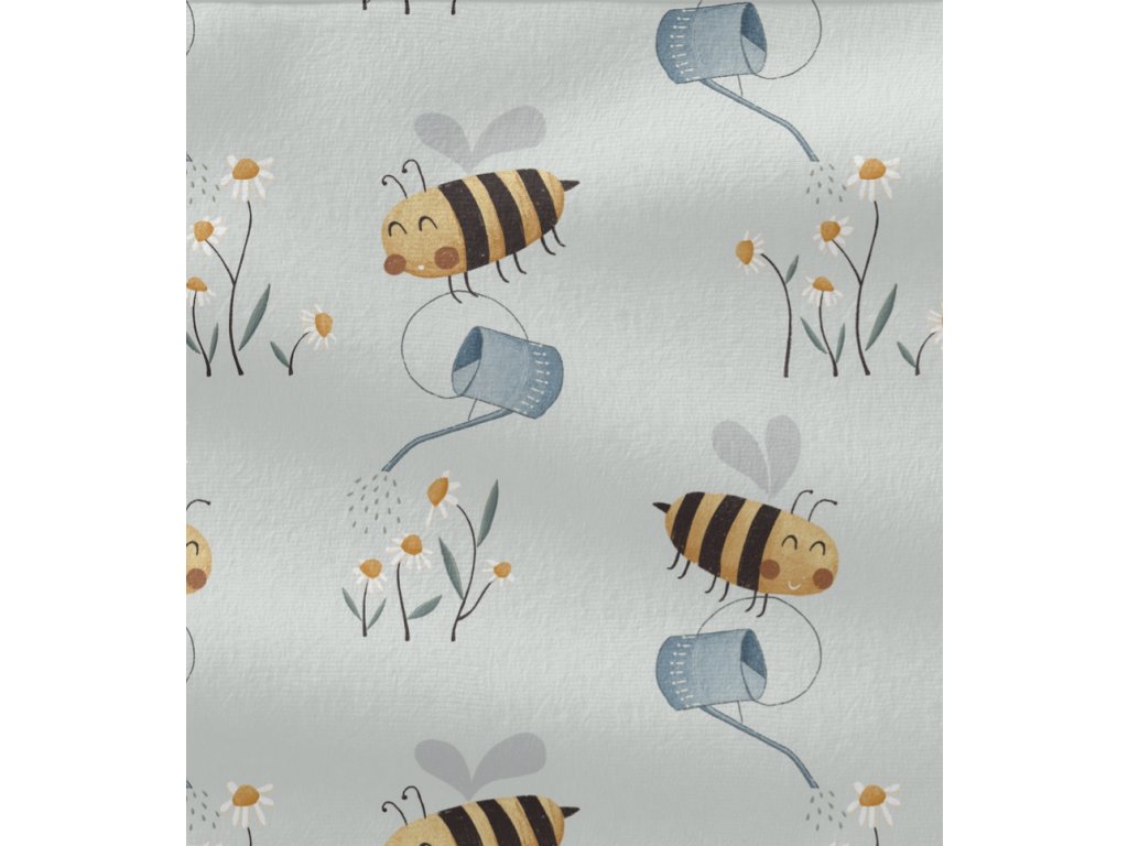 Roztomilý potisk včelek poletujících kolem zahradních konviček na jemném podkladu působí mile a optimisticky. Látku lze snadno kombinovat s jednobarevnými materiály v přírodních nebo pastelových tónech, což umožňuje vytvářet krásné a sladěné sety.