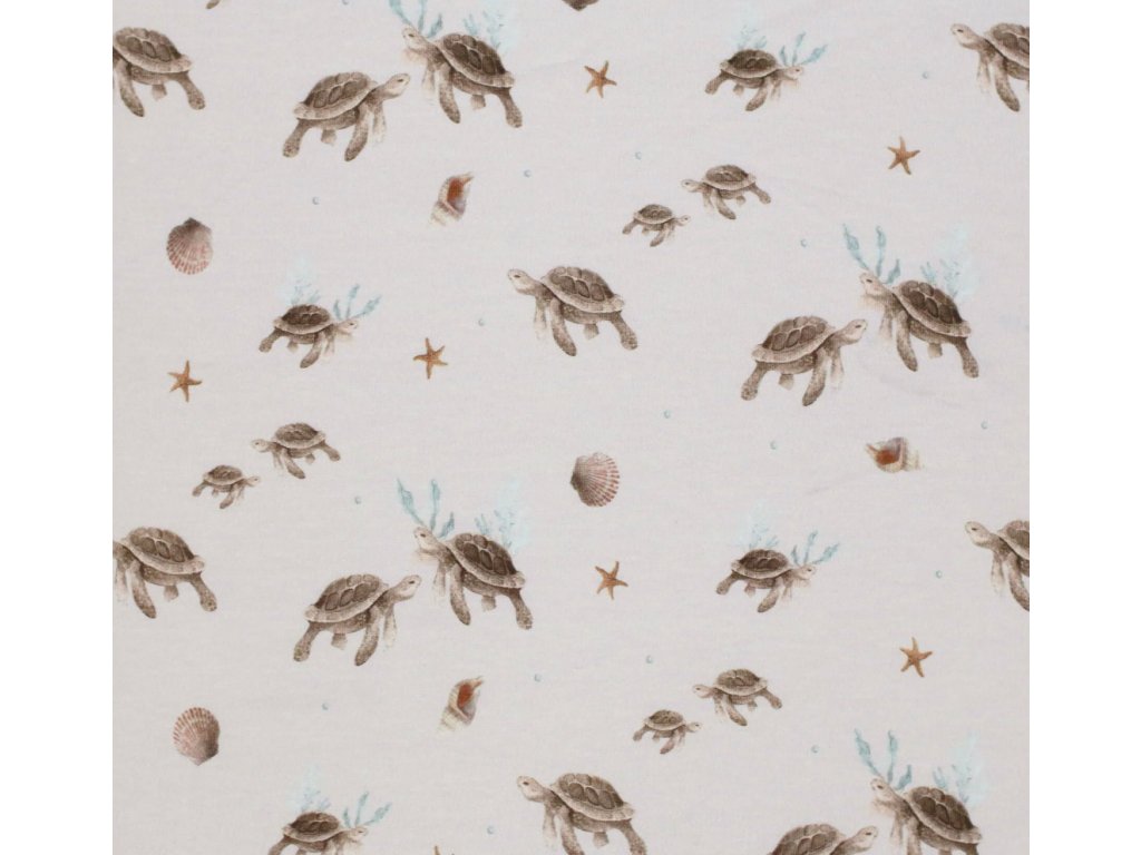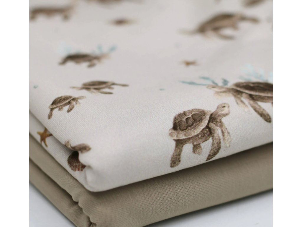 Úplet - Želvy je měkký a prodyšný úplet, vhodný na trička, šaty, pyžama i dětské oblečení. Materiál je poddajný, příjemný k pokožce a dobře se šije, takže je vhodný i pro začínající švadleny. Snadno jej zkombinujete s jednobarevnými i vzorovanými látkami.