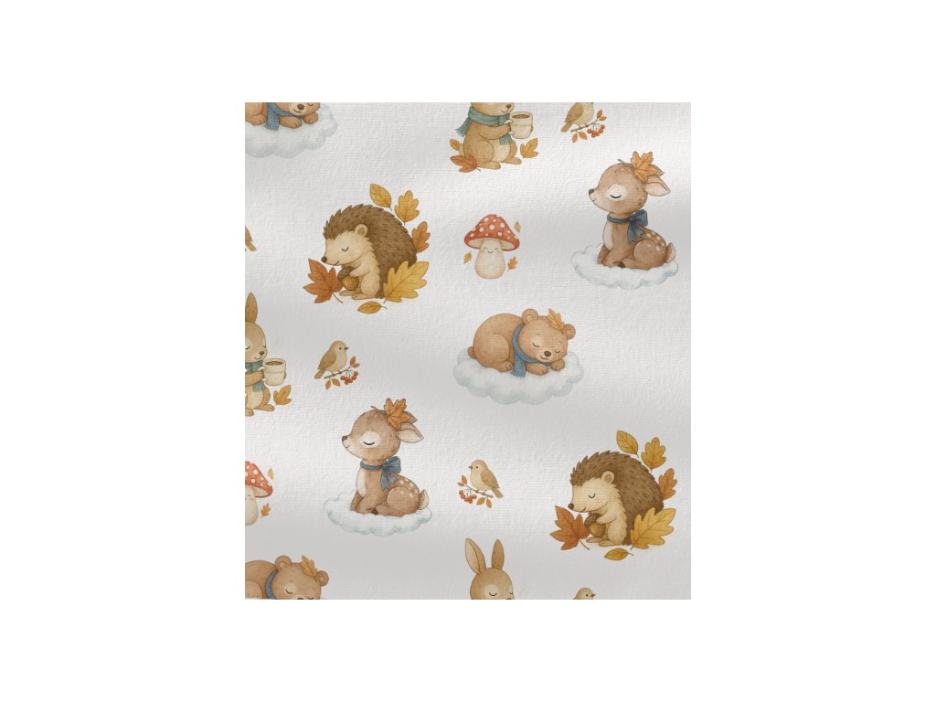 Kouzelný úplet s motivem zvířátek v zimním spánku navodí útulnou a klidnou atmosféru. ❄️ Je jemný, hebký a příjemný na nošení, ideální pro děti i dospělé. Díky pružnosti se krásně přizpůsobí postavě a snadno se šije. ✂️