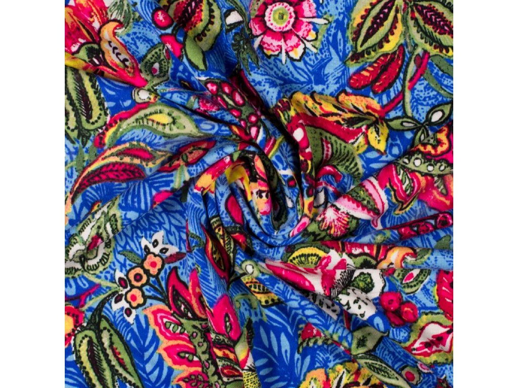 Viskozový úplet - Divoké květy je měkký a prodyšný úplet, vhodný na trička, šaty, pyžama i dětské oblečení. Materiál je poddajný, příjemný k pokožce a dobře se šije, takže je vhodný i pro začínající švadleny. Snadno jej zkombinujete s jednobarevnými i vzorovanými látkami.