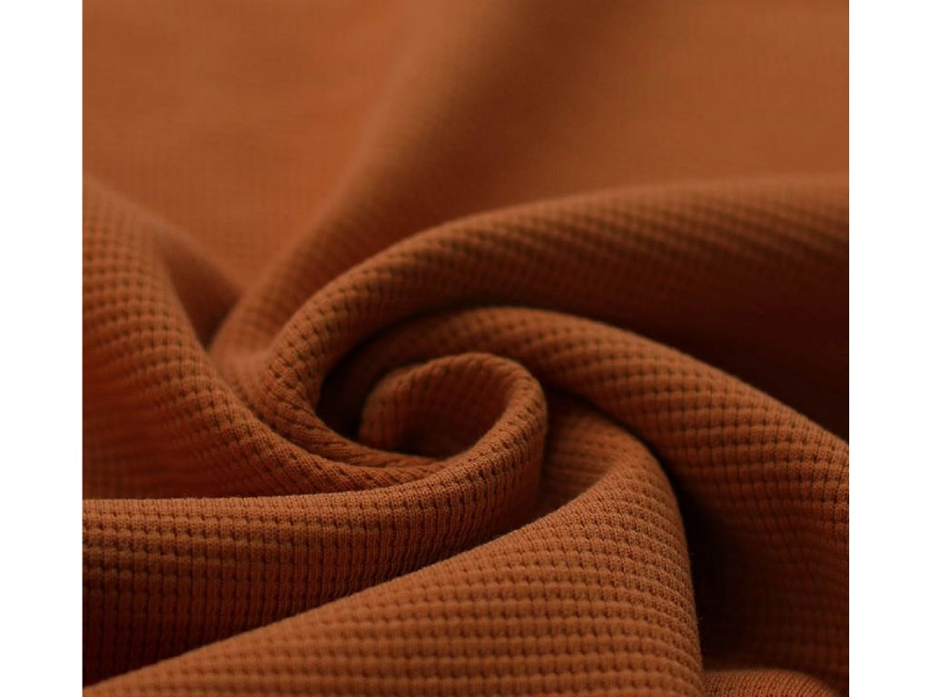 Wafle- Koňak je měkký a prodyšný úplet, vhodný na trička, šaty, pyžama i dětské oblečení. Materiál je poddajný, příjemný k pokožce a dobře se šije, takže je vhodný i pro začínající švadleny. Snadno jej zkombinujete s jednobarevnými i vzorovanými látkami.