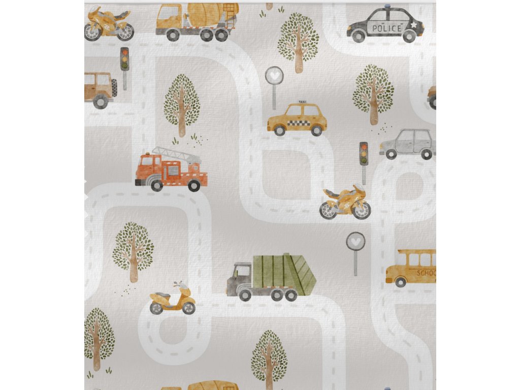 Žebrovaný úplet -Auta ve městě je pružný a pohodlný materiál se žebrovanou strukturou, který pěkně přiléhá k tělu a zároveň drží tvar. Hodí se na trička, šaty, legíny, čepice a nákrčníky pro děti i dospělé. Díky směsi bavlny s elastanem je příjemný na dotek, prodyšný a snadný na údržbu – ideální pro každodenní nošení.