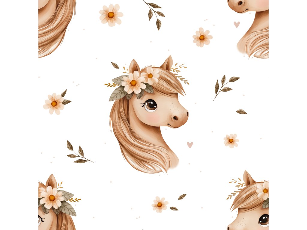 Potisk roztomilého koníka s jemnými detaily na bílém podkladu působí čistě, něžně a univerzálně. Látku lze snadno kombinovat s jednobarevnými úplety v pastelových i přírodních odstínech pro harmonický výsledek.
