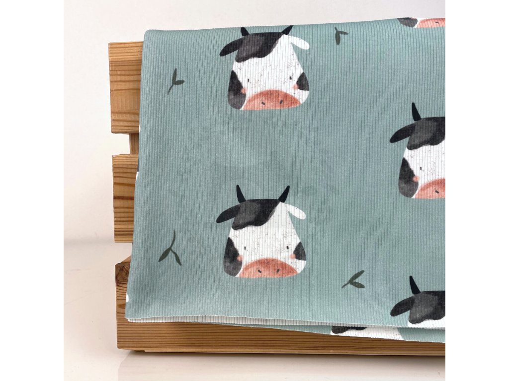 Žebrovaný úplet - Kravičky je pružný a pohodlný materiál se žebrovanou strukturou, který pěkně přiléhá k tělu a zároveň drží tvar. Hodí se na trička, šaty, legíny, čepice a nákrčníky pro děti i dospělé. Díky směsi bavlny s elastanem je příjemný na dotek, prodyšný a snadný na údržbu – ideální pro každodenní nošení.